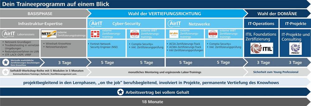 Du möchtest dich persönlich weiterentwickeln? Vom Administrator zum Consultant? Vom IT Mitarbeiter zum Projektleiter? Möchtest Du ein gefragter Experte für komplexe Infrastruktur werden? Dann geh mit uns den nächsten Schritt! Wir vereinbaren ein sehr individuelles Trainee-Programm, in dem Du sehr schnell vorankommst. Unsere eigene Laborumgebung und die marktanerkannten Zertifizierungspfade unserer Partner zeigen Dir einen sehr konkreten Weg auf. Engmaschige Zielfördergespräche und Coachings heben Dich auf den nächsten Level!