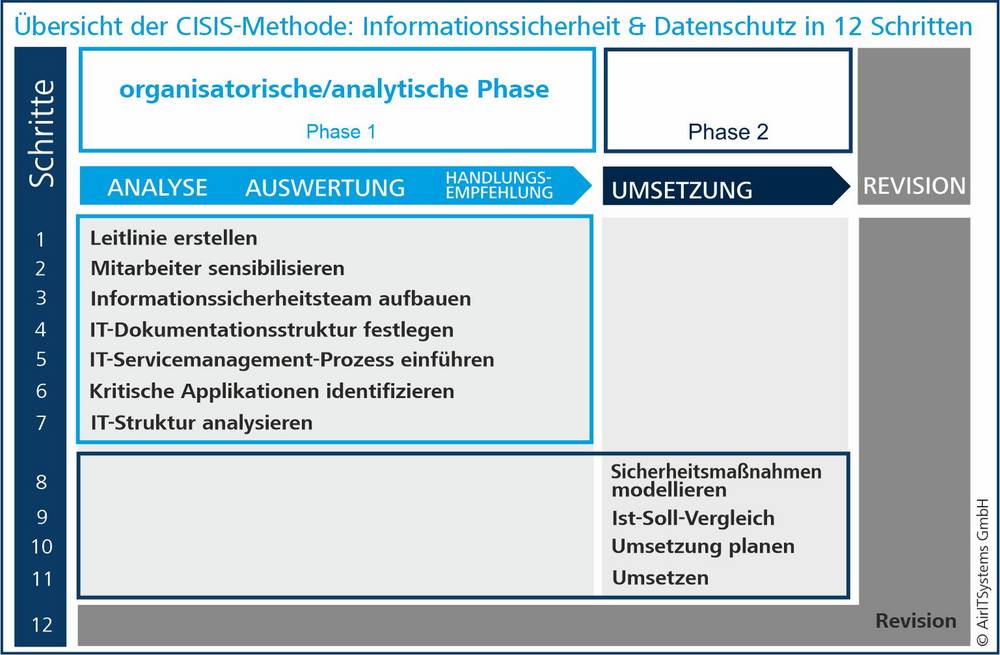 - Anwendung gängiger Sicherheitsstandards wie dem Grundschutz des BSI, der ISO-Norm 27001 oder CISIS12 (D/ISMS in 12 Schritten)
