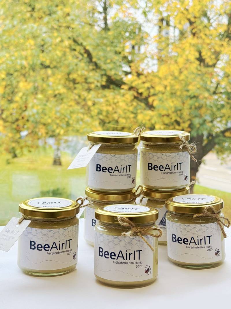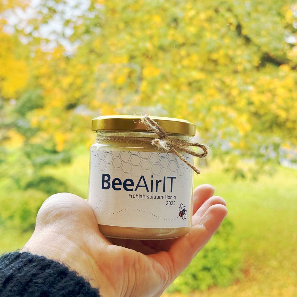 Am Rand einer Wildhecke, im Sonnenschein zwischen Feldern und Waldrand, herrscht reges Summen. Ein idealer Platz, um fleißig Nektar zu sammeln. Wir sind zu Besuch bei unserem Bienenvolk und treffen unseren Bienenexperten, der das AirIT-Bienenvolk und über 40 weitere Bienenvölker liebevoll betreut. Die Sonne steht tief, der Duft von Blüten liegt in der Luft, und an der Beute glänzt nun ein kleines AirIT-Schild, als sichtbares Zeichen unserer Verbundenheit mit dem Projekt und unseren kleinen Helferinnen.